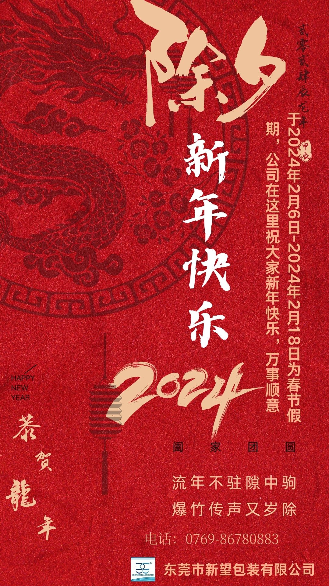于2024年2月6日-2024年2月18日為春節假期,公司在這里祝大家新年快樂,身體健康、萬事順利!